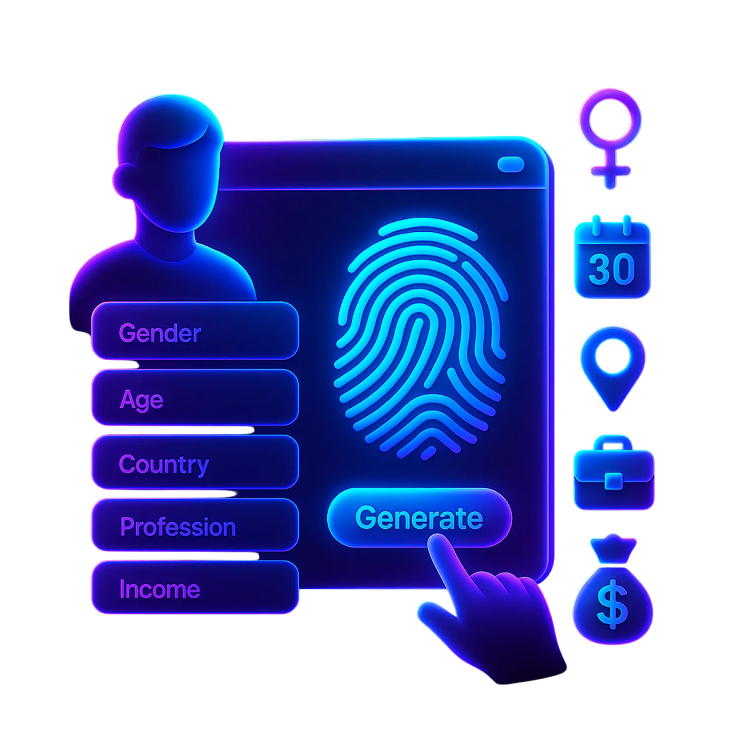 Используя искусственный интеллект, вы можете самостоятельно создать фингерпринт на основе реальной личности из нашей внутренней базы данных, задав необходимые параметры, такие как пол, возраст, страна, профессия и уровень дохода. Всё это формирует взаимосвязанный правдоподобный цифровой образ, которому доверяют платформы и антифрод-системы.